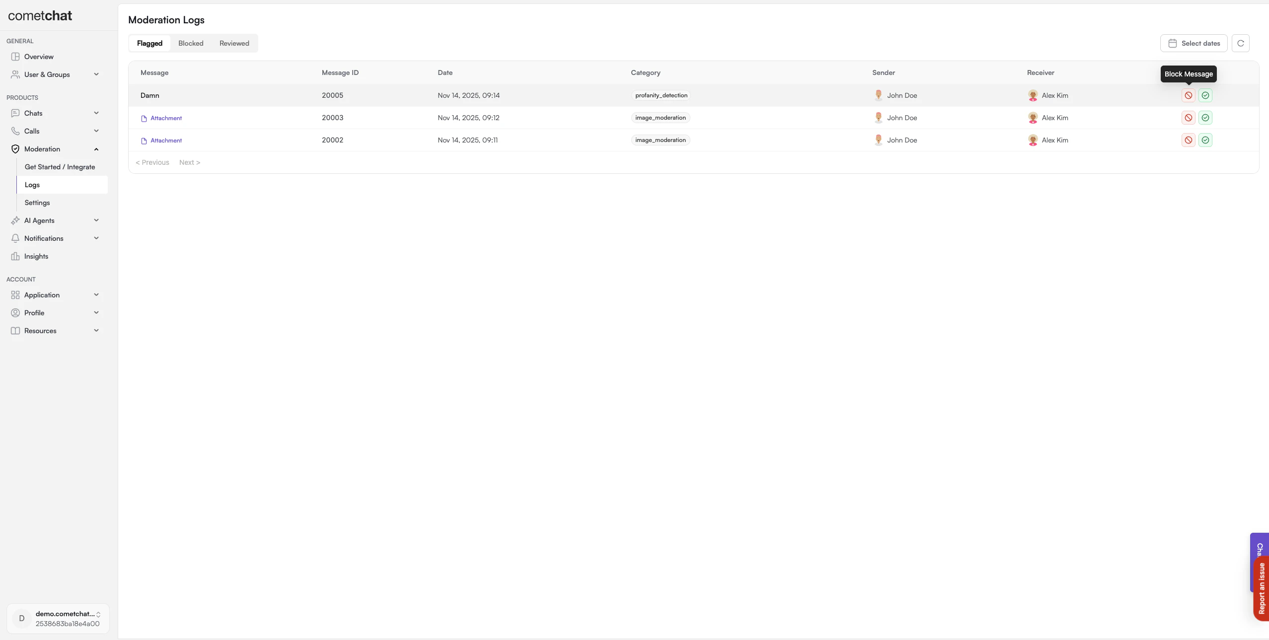 Login to CometChat Dashboard → Select your app → Moderation → Flagged Messages