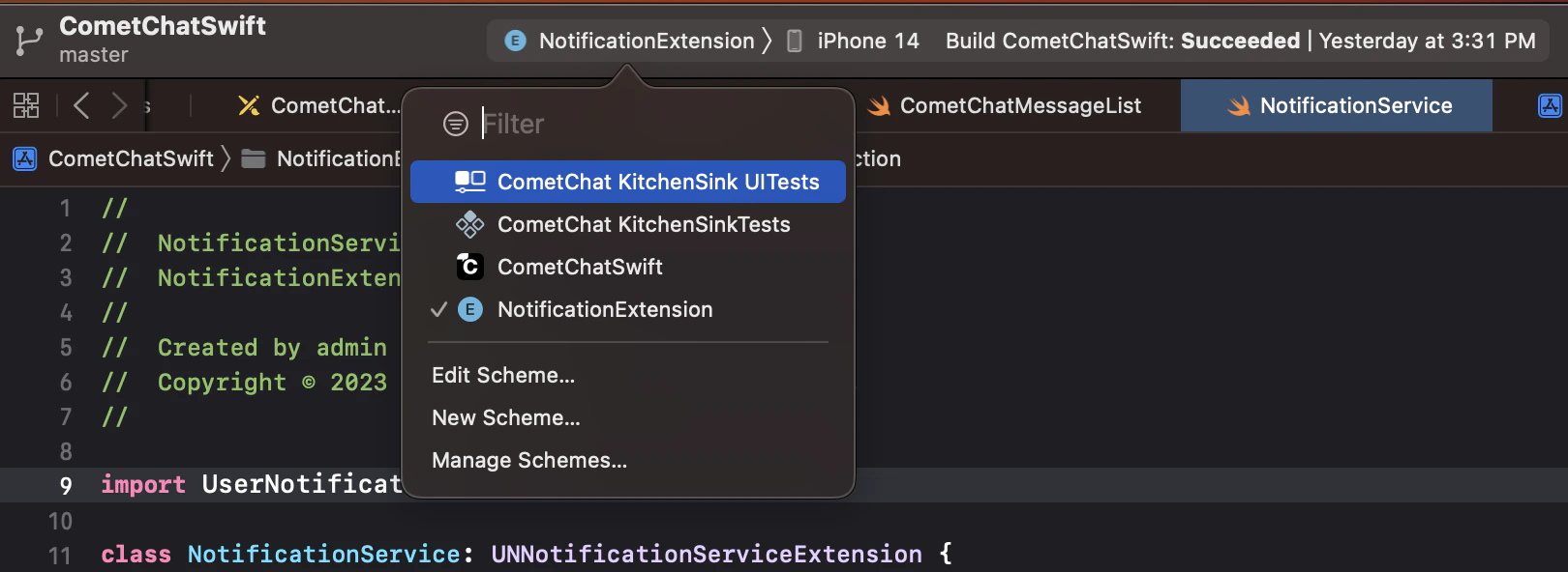 - Your notification service extension is ready now, you can see that in the target list. Now we will create app group for the extension. This app group will be needed to share user default between the main application and notification service extension.