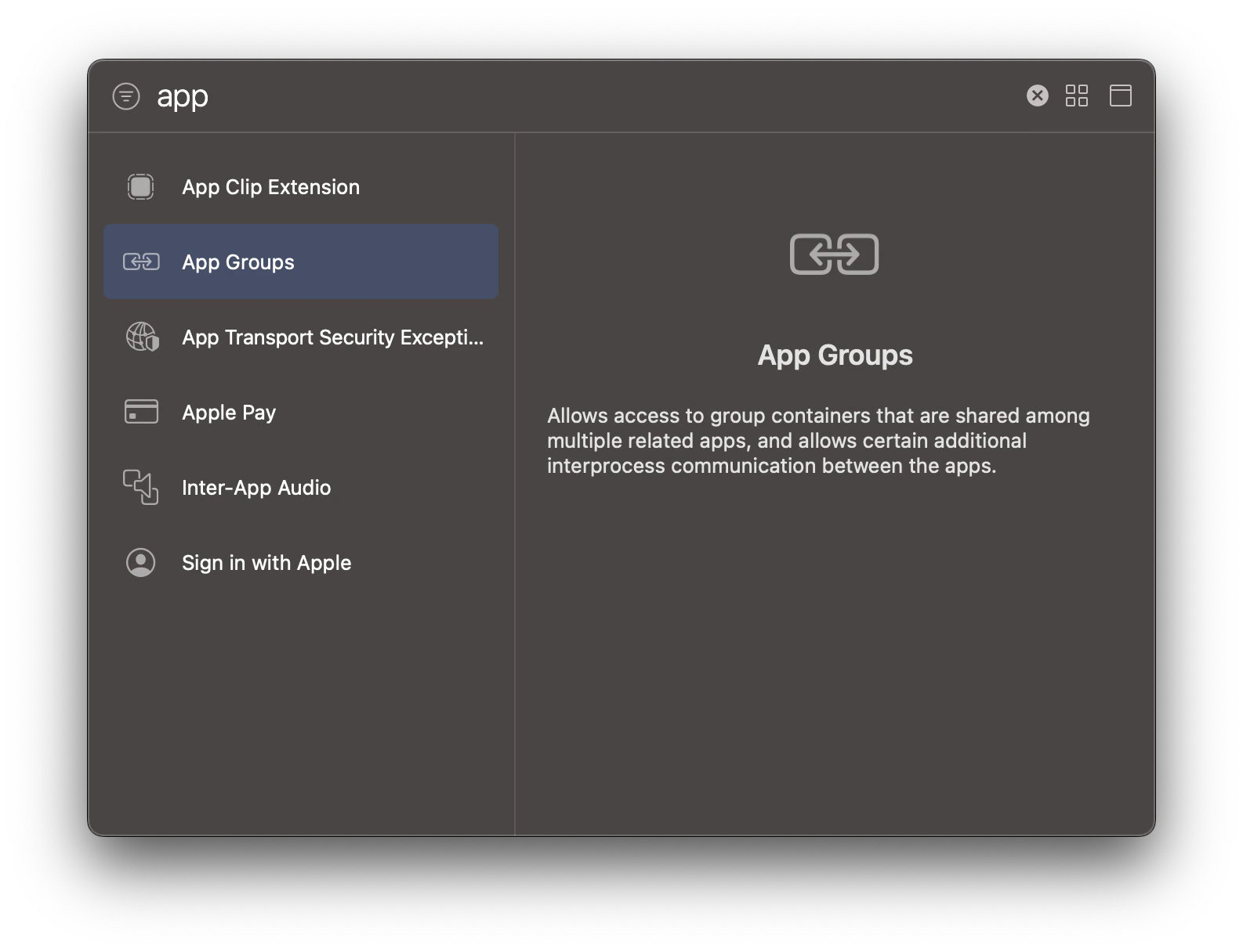 - Then search for App Group and click on it. You can see a section of the app group section must have been added on the ‘Signing & Capabilities’.