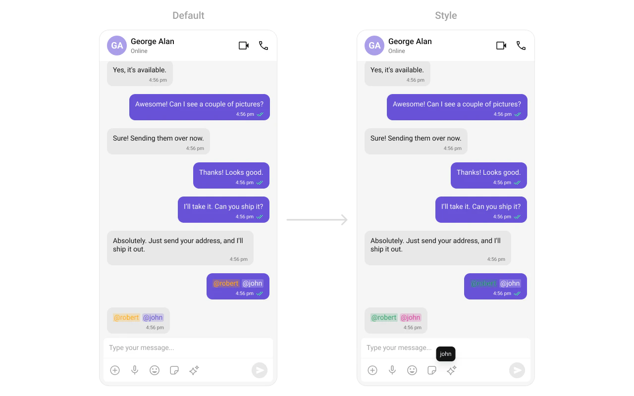 Custom stylesColors, fonts, and backgrounds per context (composer, bubbles, conversations)