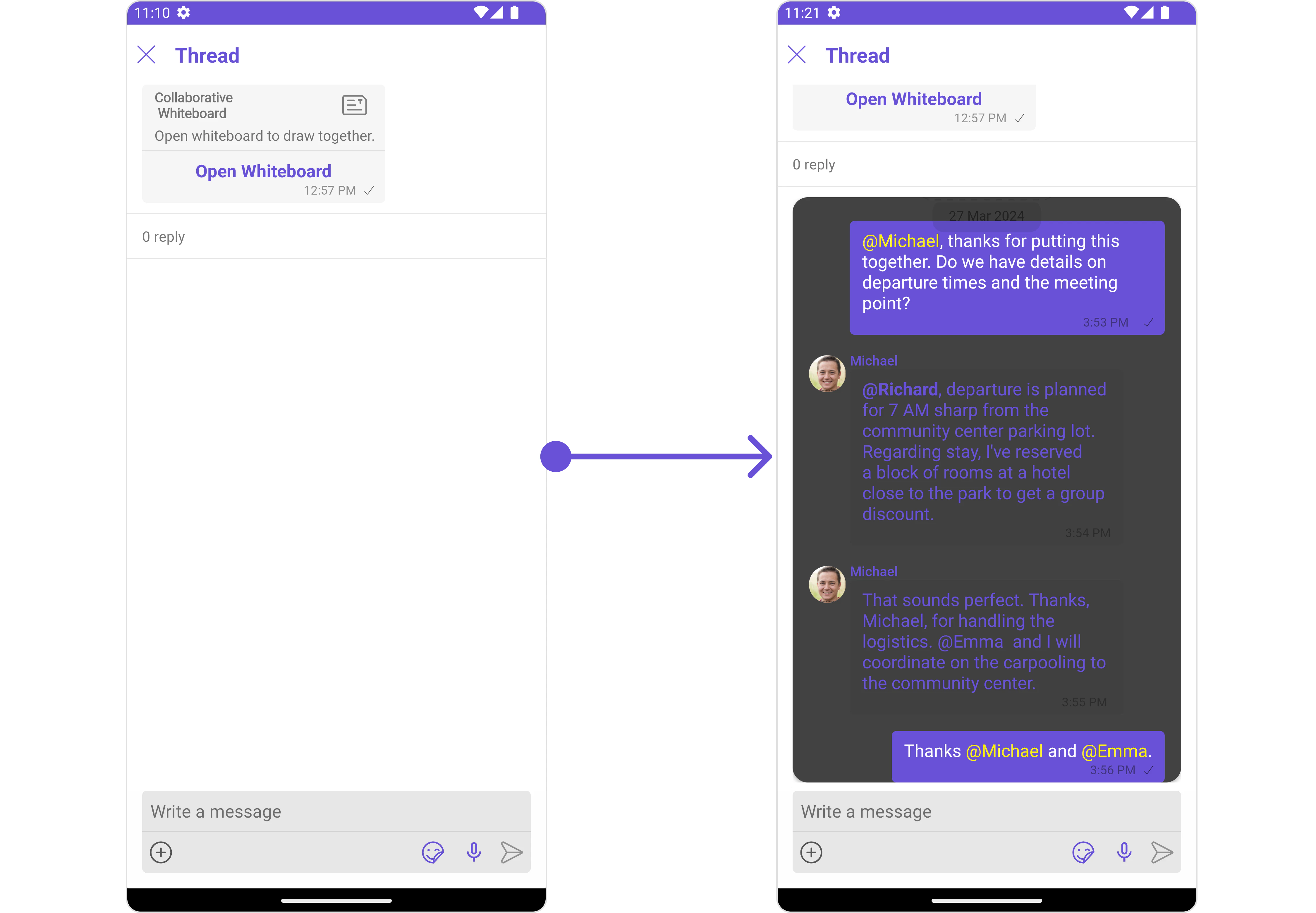 Actions dictate how a component functions. They are divided into two types: Predefined and User-defined. You can override either type, allowing you to tailor the behavior of the component to fit your specific needs. ThreadedMessages does not have its own actions. However, you can override the behavior of the ThreadedMessages component by using the actions of its Components, with the help of Configurations. Example In this example, we are overriding theonThreadReplyClick of the MessageList Component using MessageListConfiguration and applying it to ThreadedMessages.