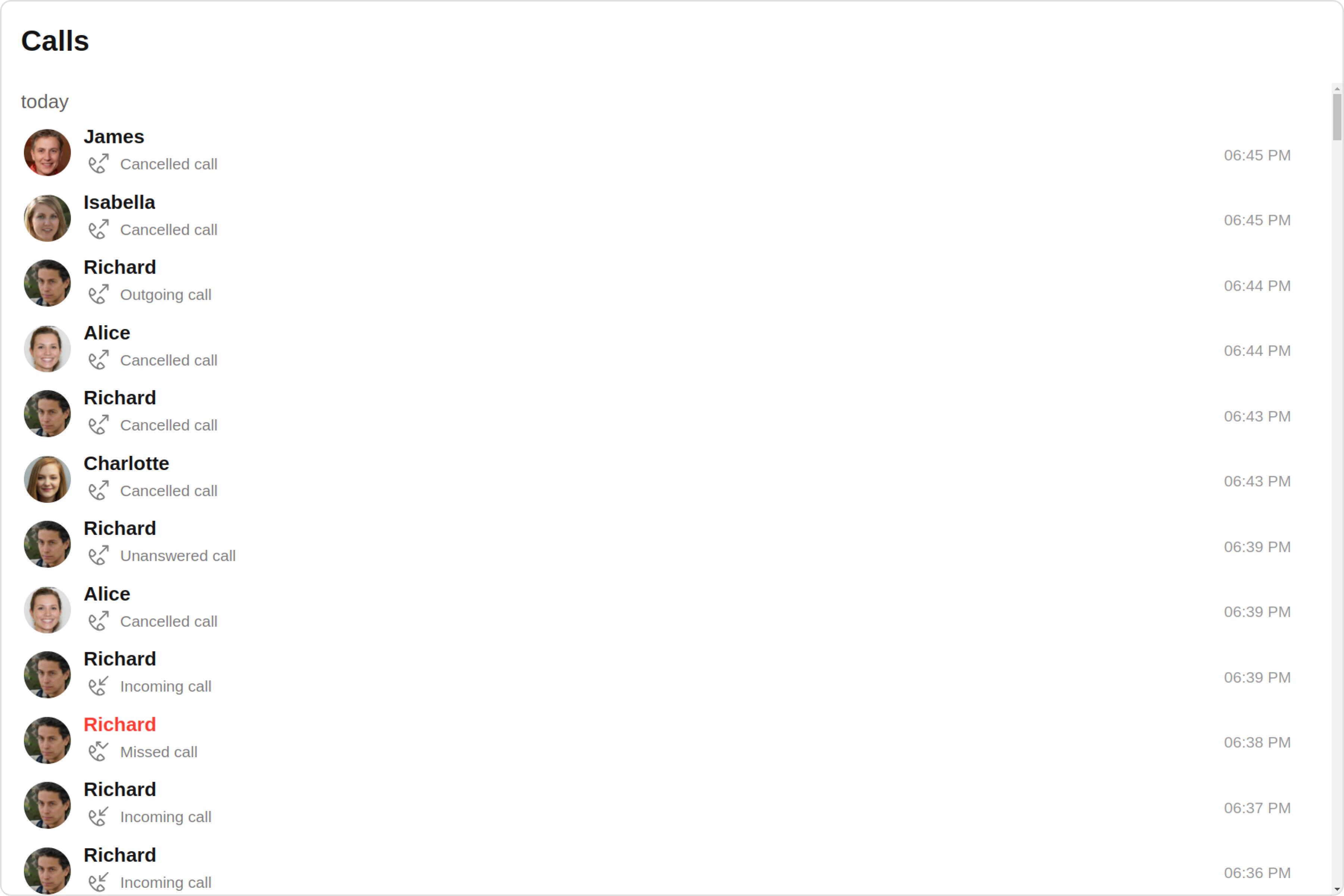 | missedCallIconTint | Used to set missed call icon tint | missedCallIconTint?: string; |