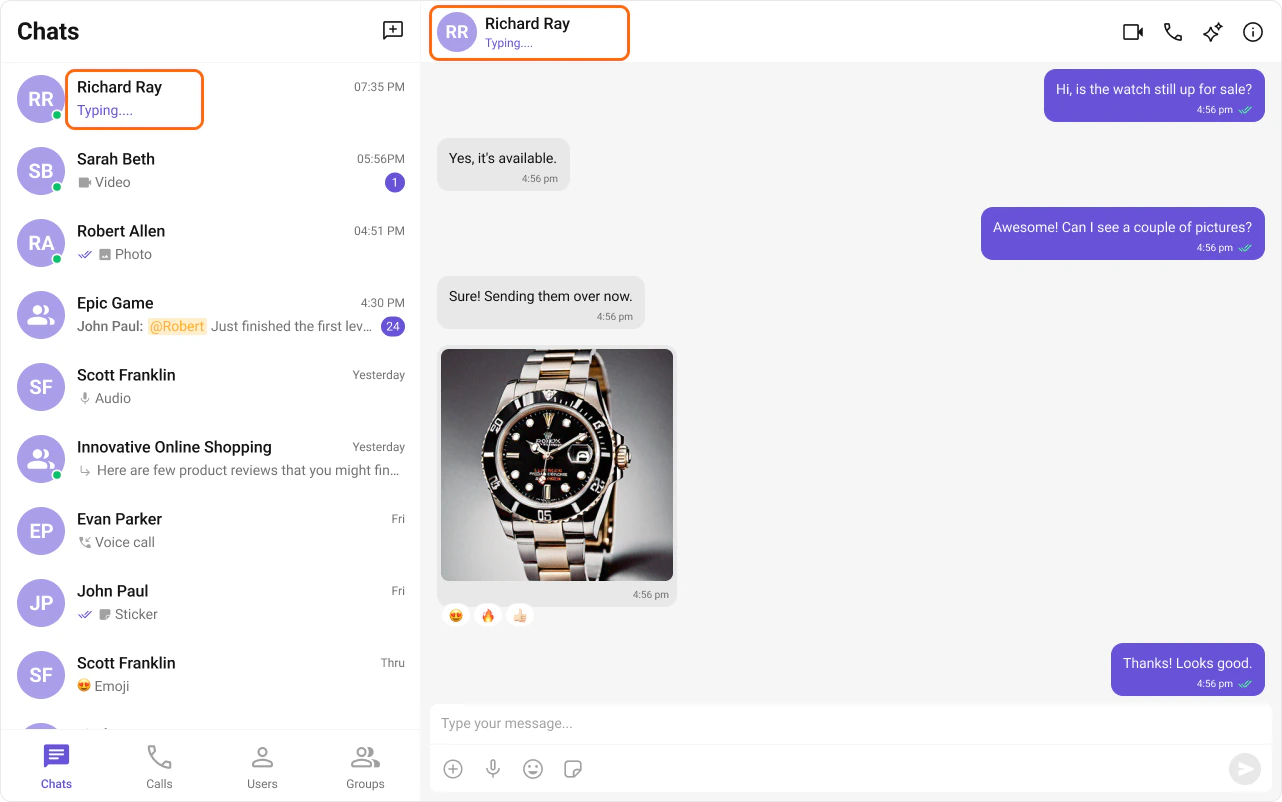 The Typing Indicator shows when a user is composing a response in real time, making conversations feel more natural and interactive.