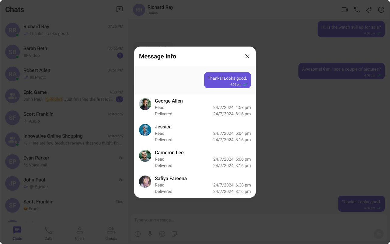 Read Receipts provide visibility into message status, letting users know when a message has been delivered and read. This brings clarity to communication and sets expectations about engagement.