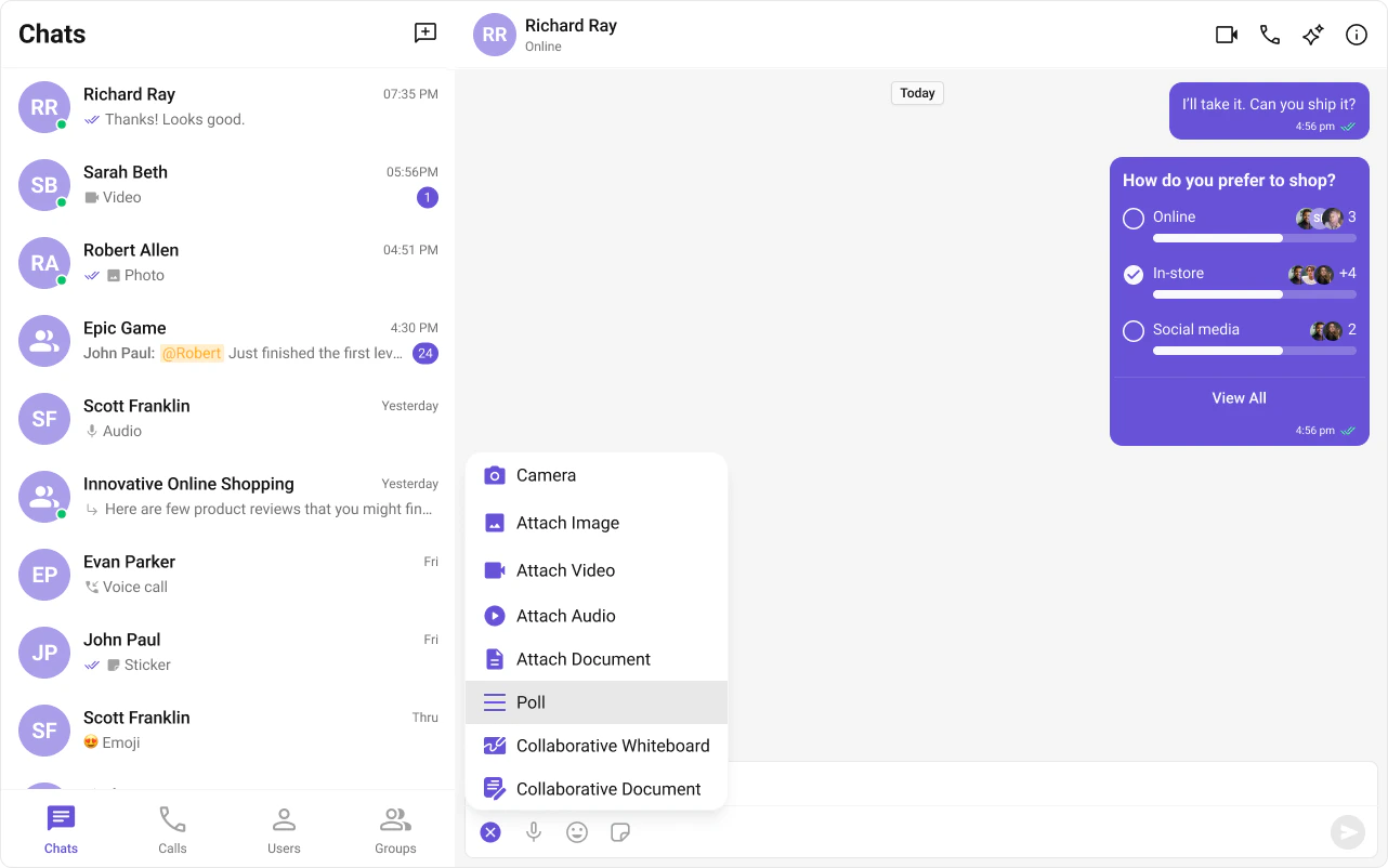 Creates polls in group discussions with predefined answer options. Auto-integrates into the Action Sheet of cometchat-message-composer when activated.