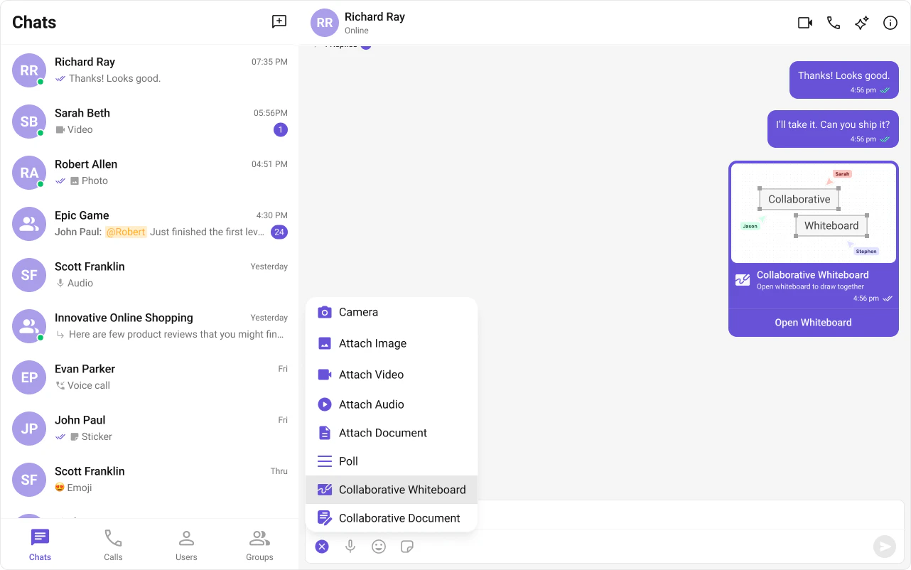 Real-time shared whiteboard for drawing and brainstorming. Auto-integrates into the Action Sheet of cometchat-message-composer when activated.
