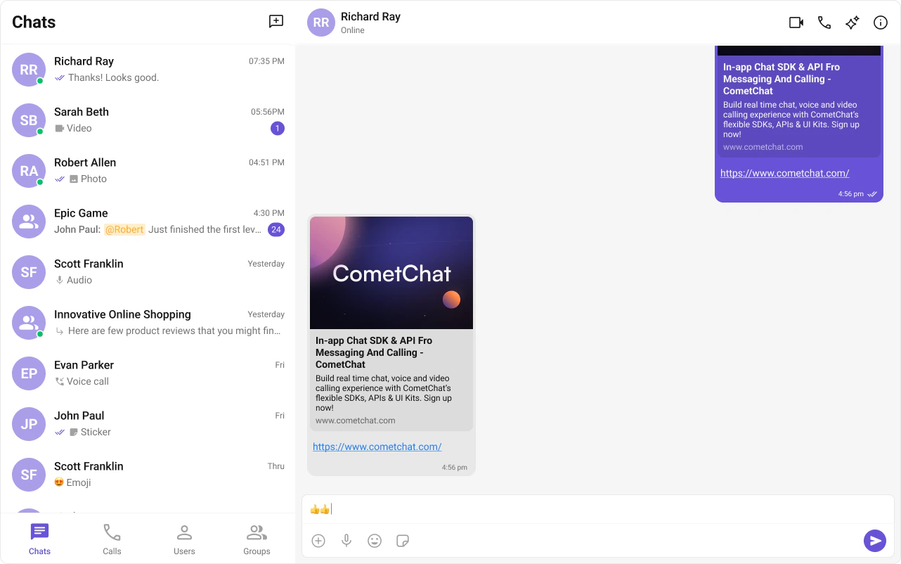 CometChat UI Kit includes built-in support for extensions that add interactive, secure, and efficient features to chat. Extensions are activated from the CometChat Dashboard and auto-integrate into UI Kit components on init and login.