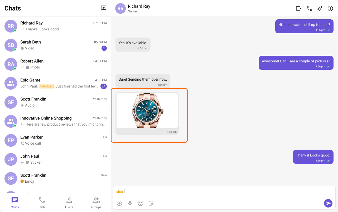 Creates smaller preview images for shared images, reducing bandwidth. Auto-integrates into the Message Bubble of cometchat-message-list when activated.