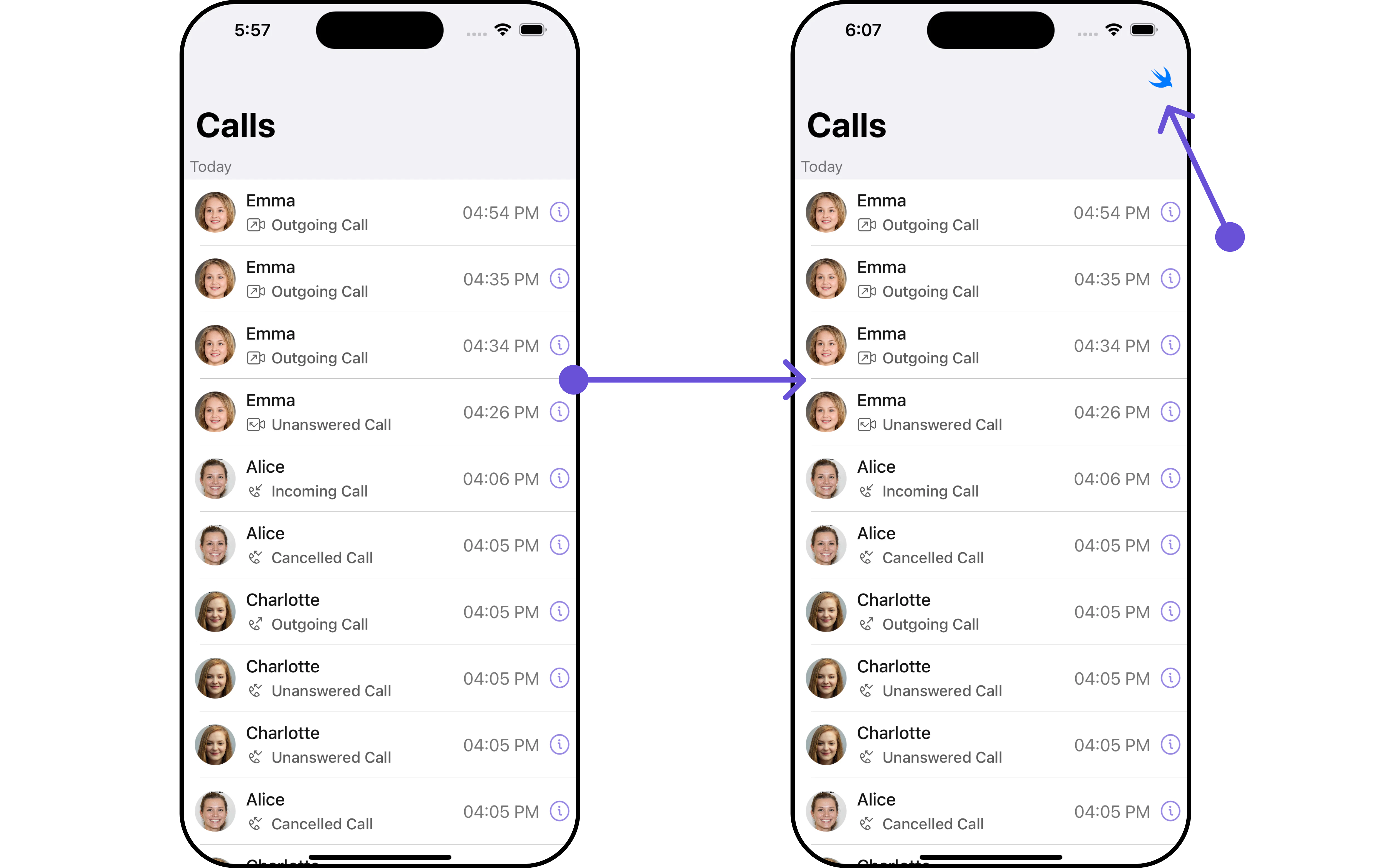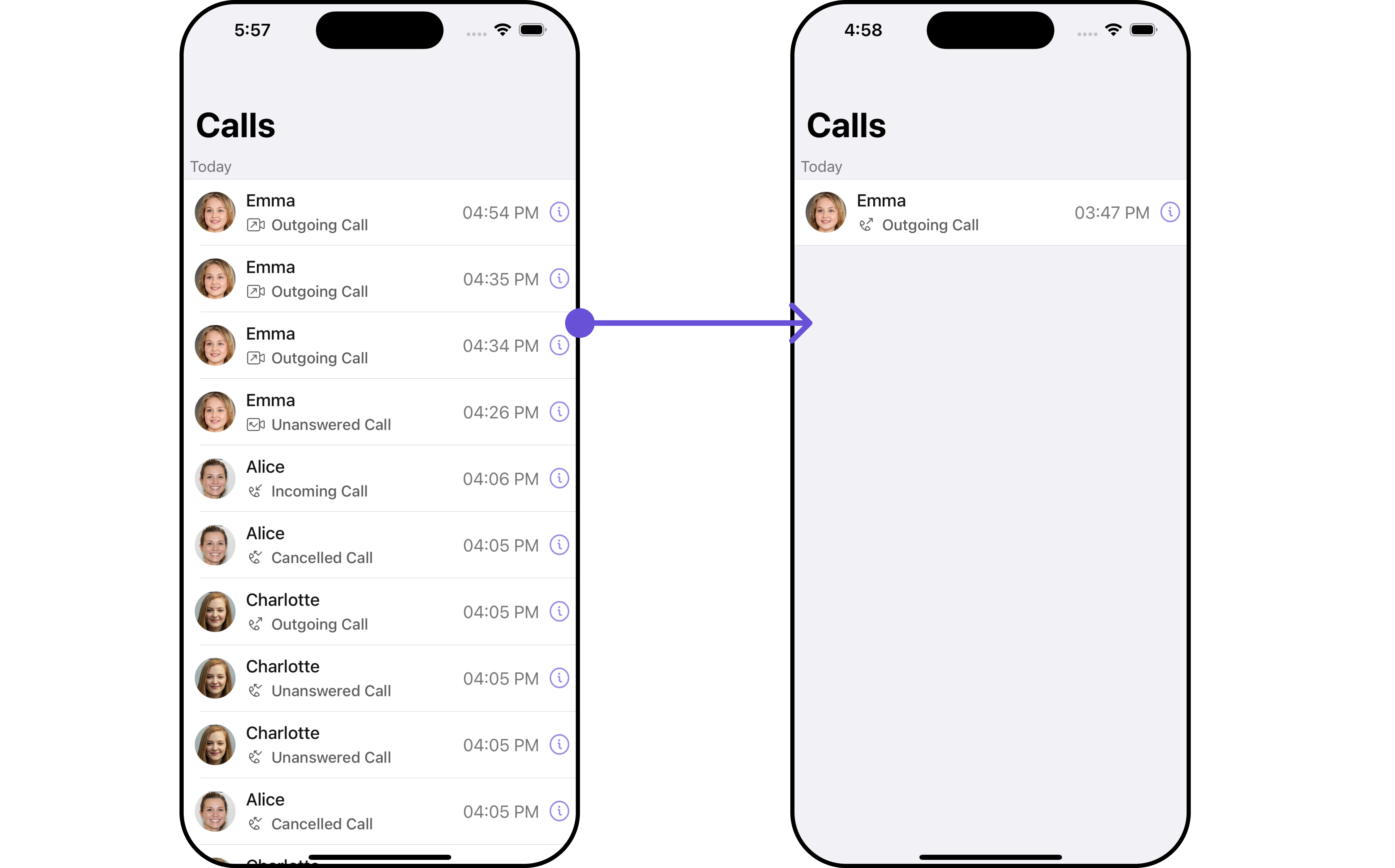 Ensure to pass and present CometChatCallLogsWithDetails. If a navigation controller is already in use, utilize the pushViewController function instead of directly presenting the view controller.