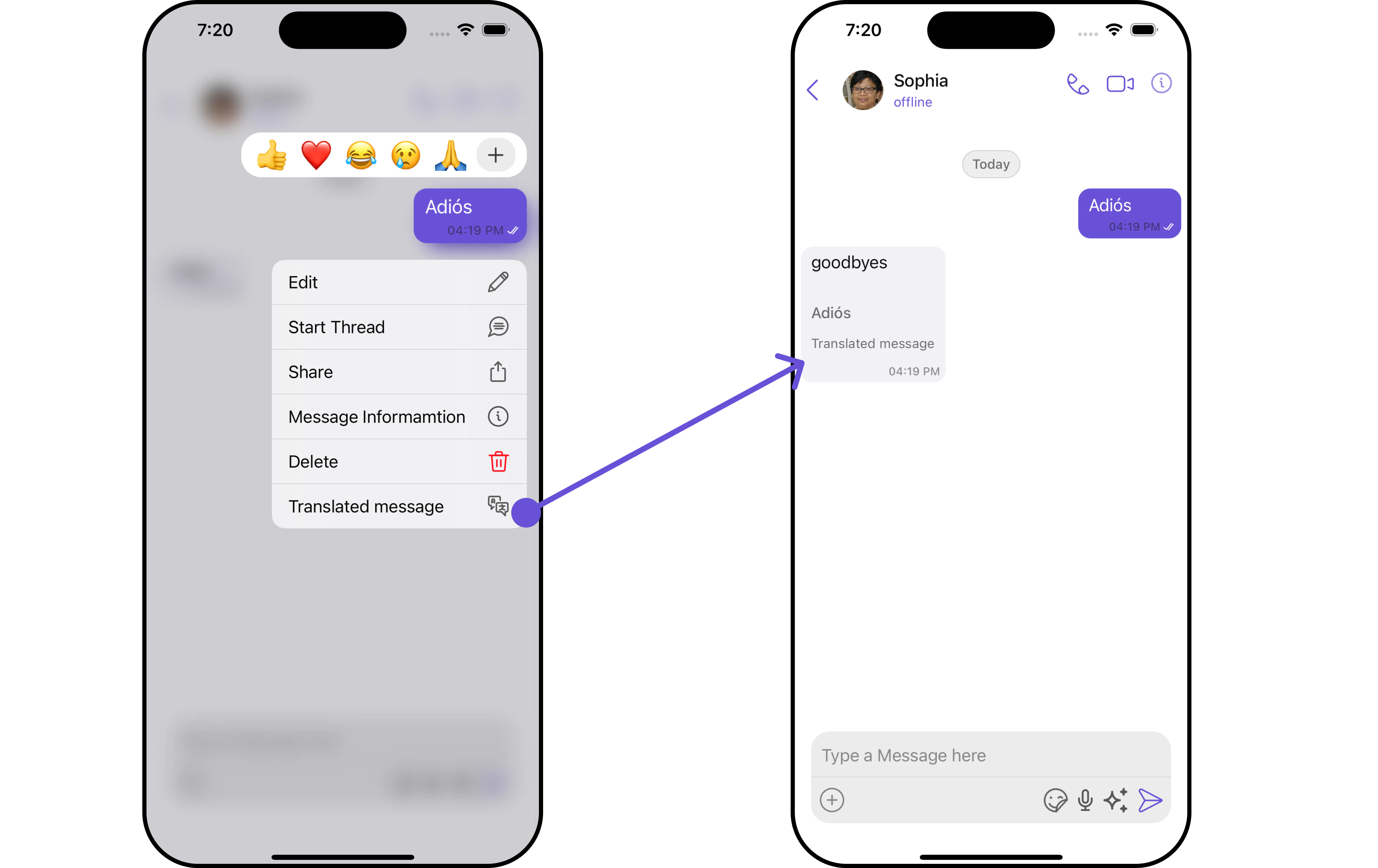 The Message Translation extension in CometChat is designed to translate any message into your local. It eliminates language barriers, making the chat more inclusive. For a comprehensive understanding and guide on implementing and using the Message Translation Extension, refer to our specific guide on the Message Translation Extension. Once you have successfully activated the Message Translation Extension from your CometChat Dashboard, the feature will automatically be incorporated into the Action Sheet of MessageList Component component of UI Kits.