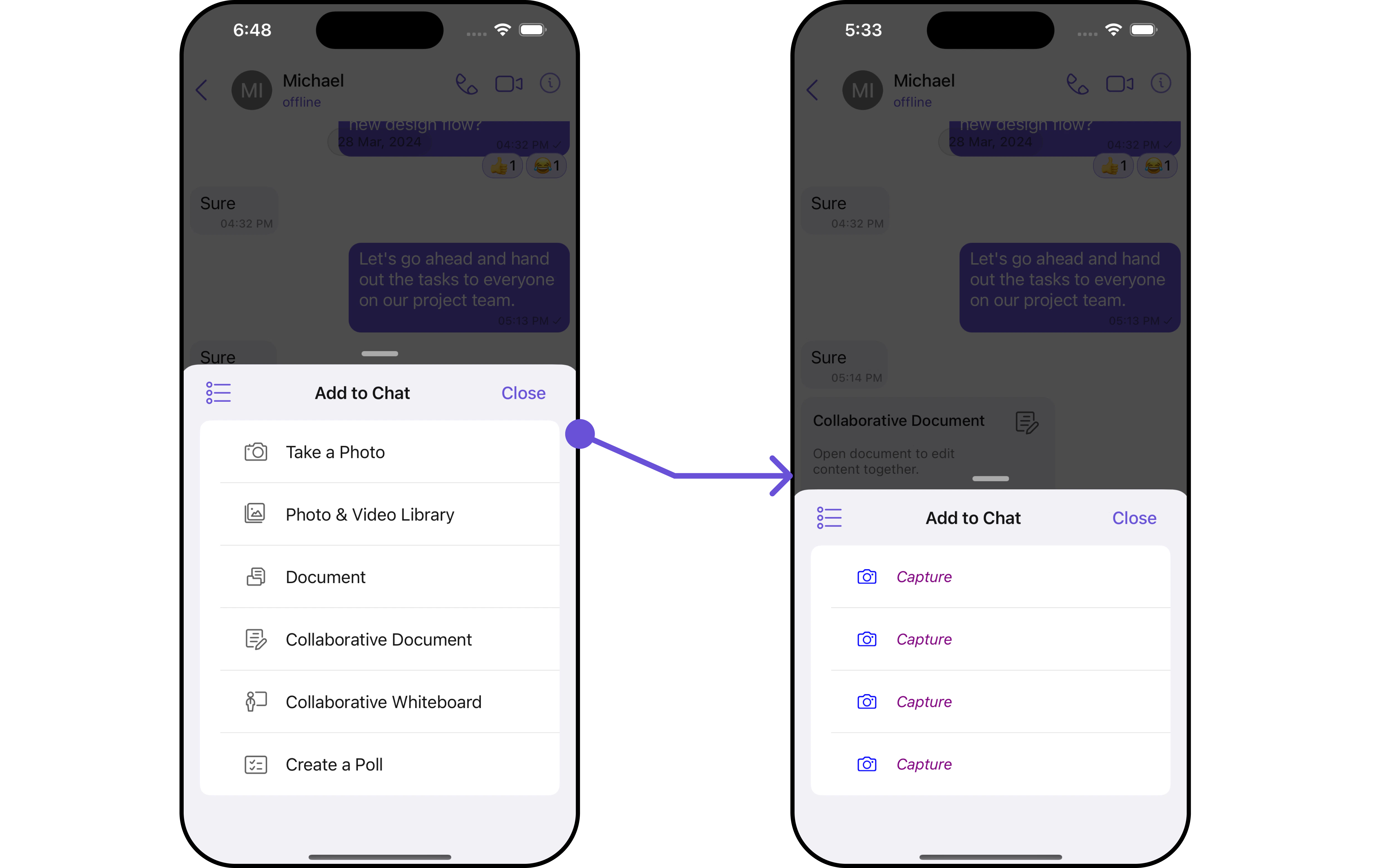 You can insert a custom view into the MessageComposer component to add additional functionality using the following method.- Swift