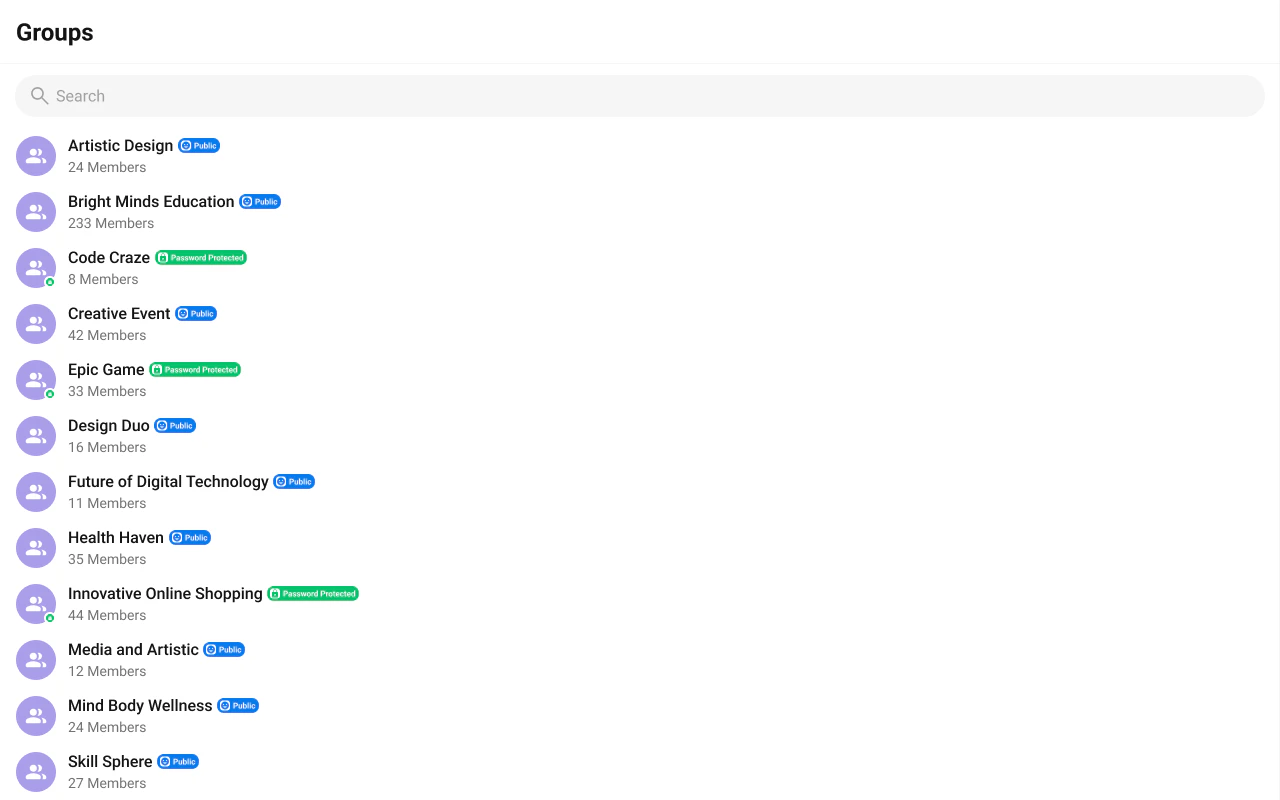 | Search by keyword | new CometChat.GroupsRequestBuilder().setSearchKeyword("design") |