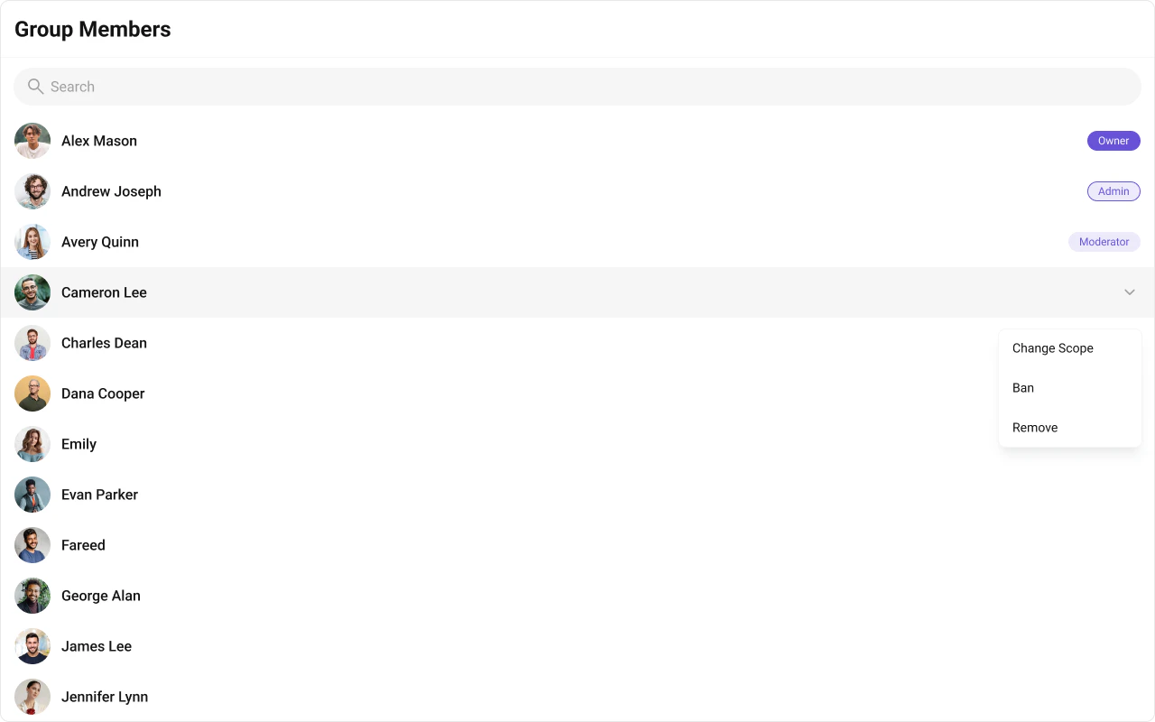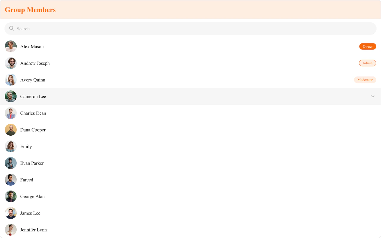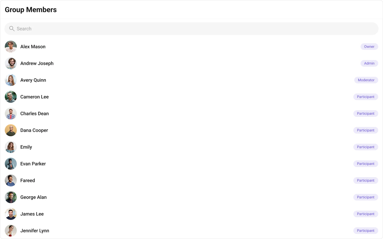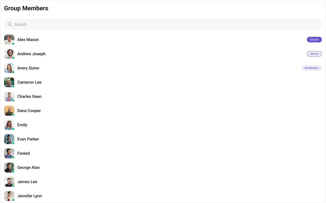 CometChatGroupMembers is a Component that displays all users added or invited to a group, granting them access to group discussions, shared content, and collaborative features. Group members can communicate in real-time via messaging, voice and video calls, and other activities. They can interact, share files, and join calls based on group permissions set by the administrator or owner.